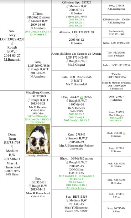 Bonny is geboren op 13-01-2022 op een schapenboerderij in België. Samen met 7 broertjes en zusjes is zij opgegroeid tussen de schapen. Eenmaal in onze roedel paste zij zich snel aan en hoewel niet al onze honden direct gecharmeerd waren van haar was zij dat wel van hen. Ze is een open en vrolijke hond. Buiten het veld is ze zeer gehoorzaam maar eenmaal bij de schapen heeft ze nog veel last van haar drive. Hoewel ze het werk snel oppakt zal ze nog wat volwassener moeten worden om het werk ook rustig te doen. Gelukkig behandeld ze haar schapen wel netjes. Ze is heel goede maatjes met Bill en zal over een paar jaar samen met hem aan het werk moeten.